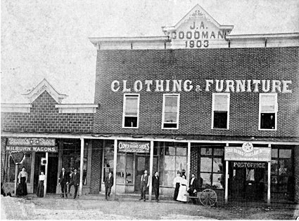 Goodman Dry Goods building at the present location of the Strand Theatre in the Discovery Center. Bricks from the Goodman building were re-used in the theatre. Paint from the "Clothing & Furniture" sign is still visible on some bricks.